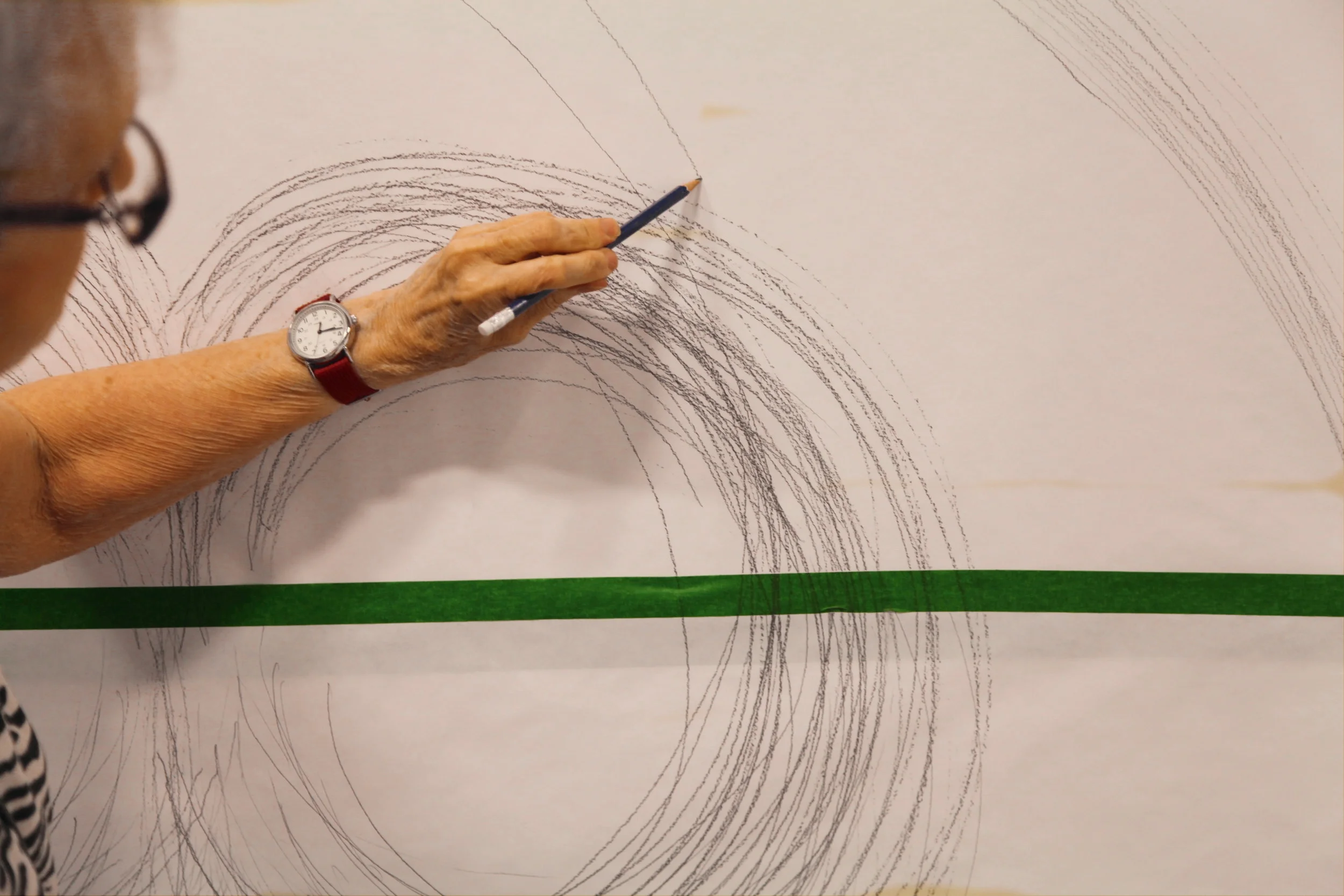 These drawing colloborations are grounded in instructions. For example, put your back to the wall, stretch out your left arm with pencil in hand, start at the bottom of the page and draw. The instructions switch back and forth between large general statements to specific, focused propositions. Both sets of instructions allow for and encourage individual creative responses. In this course I take drawing a circle, which is a standard task used to evaluate neurological function, and make it an enabling constraint. We move and draw through repetitions and variations of the circle and stimulate many parts of the neurological system.